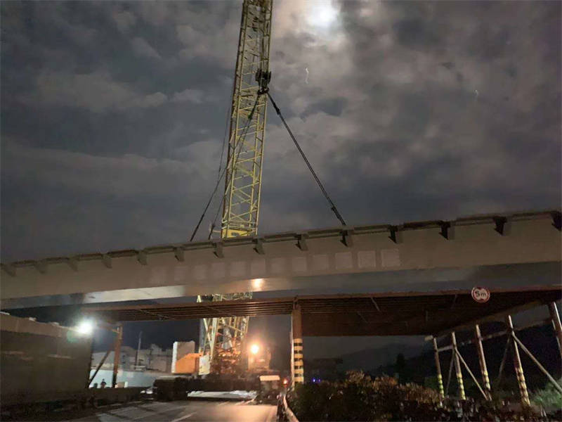 雅西跨線橋混凝土預制箱梁共計4片,本次架設的箱梁重140噸、長55余米,體積大、自身重、運輸困難,且投入的大型機械設備較多,施工組織難度大。為順利完成架設任務,市交通局多次組織召開專題會議,提前謀劃、細致安排、優(yōu)化組織,制定了施工專項方案和應急措施。