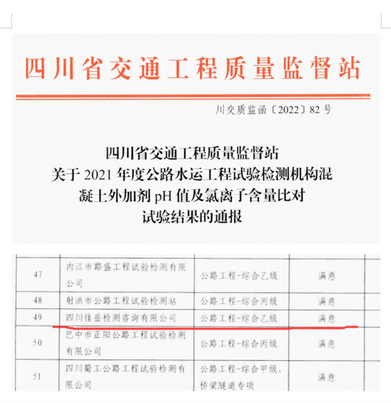 5月11日,四川省交通工程質(zhì)量監(jiān)督站印發(fā)《關(guān)于2021年度公路水運(yùn)工程試驗(yàn)檢測機(jī)構(gòu)混凝土外加劑PH值及氯離子含量比對試驗(yàn)結(jié)果的通報,交建集團(tuán)四川佳岳檢測咨詢有限公司獲得“滿意”評價。