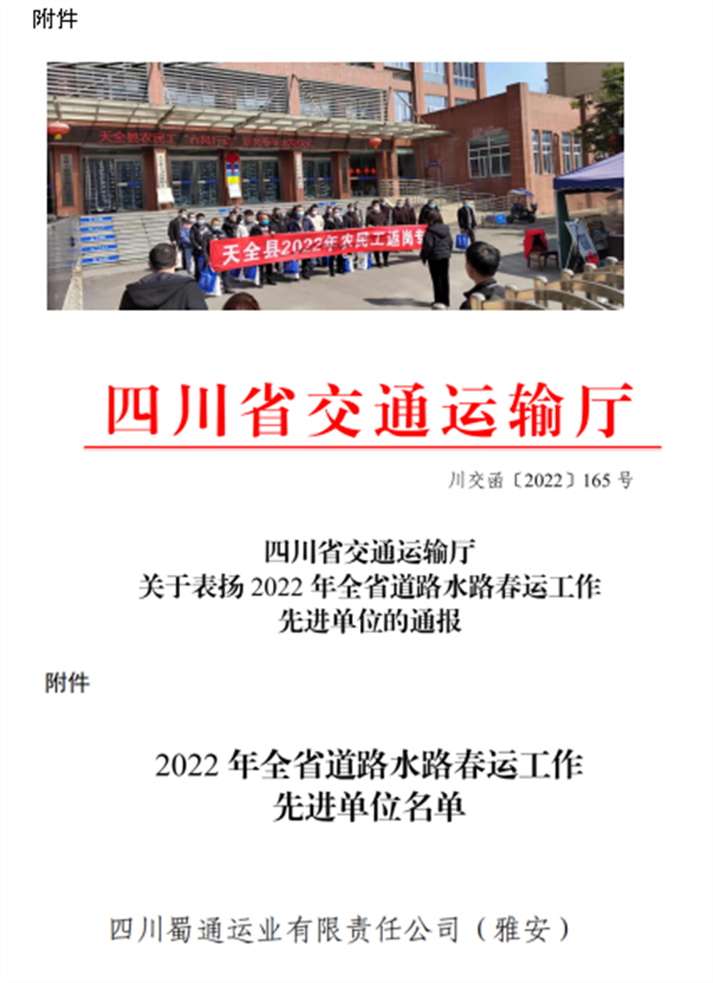 蜀通公司認(rèn)真落實(shí)各級政府和行業(yè)主管部門有關(guān)春運(yùn)工作的安排部署,堅(jiān)持以“冬安行動(dòng)”為抓手,全力以赴做好春運(yùn)期間運(yùn)輸安全和疫情防控,確保全市交通運(yùn)輸暢通、民生出行順利。2022年春運(yùn)期間,共投入班線車輛16546臺(tái),發(fā)班21269班次,其中加班422班次,安全運(yùn)送旅客26余萬人次,圓滿完成2022年春運(yùn)工作,被四川省交通運(yùn)輸廳評為“2022年全省道路水路春運(yùn)工作先進(jìn)單位”。
