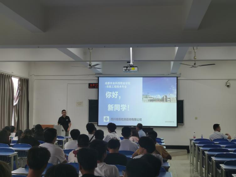為深化校企合作,促進(jìn)合作內(nèi)容全面落實落地、交流融合,近日,交建集團四川佳岳檢測公司應(yīng)邀參加成都農(nóng)業(yè)科技職業(yè)學(xué)院城鄉(xiāng)建設(shè)學(xué)院市政班入學(xué)專業(yè)教育分享會。佳岳公司檢測技術(shù)部工程師侯濤在會上作分享交流。