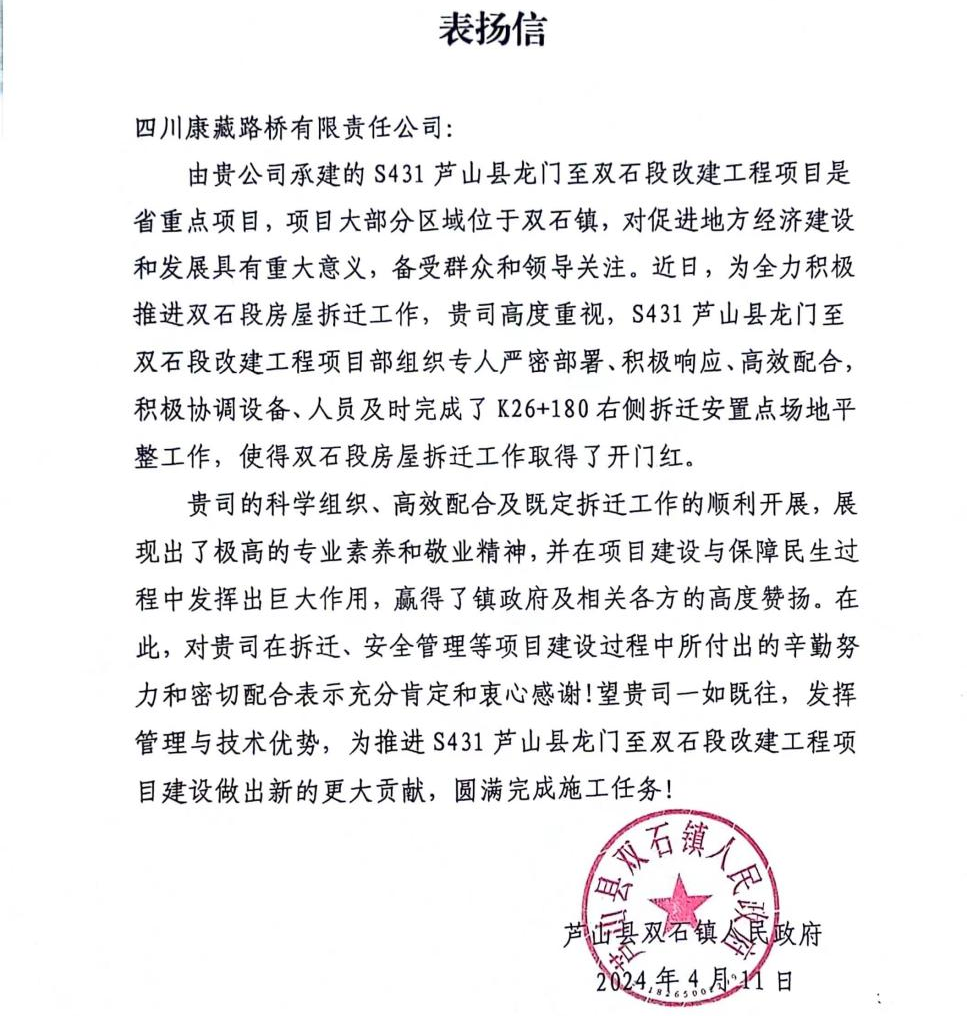 近日,雅安交建集團四川康藏路橋有限責(zé)任公司收到來自蘆山縣雙石鎮(zhèn)人民政府的表揚信。信中對S431蘆山縣龍門至雙石段改建工程項目部積極協(xié)調(diào)設(shè)備、人員配合當?shù)卣瓿蒏26+180右側(cè)拆遷安置點場地平整工作,使得雙石段房屋拆遷工作取得了開門紅給予了高度評價和贊揚。