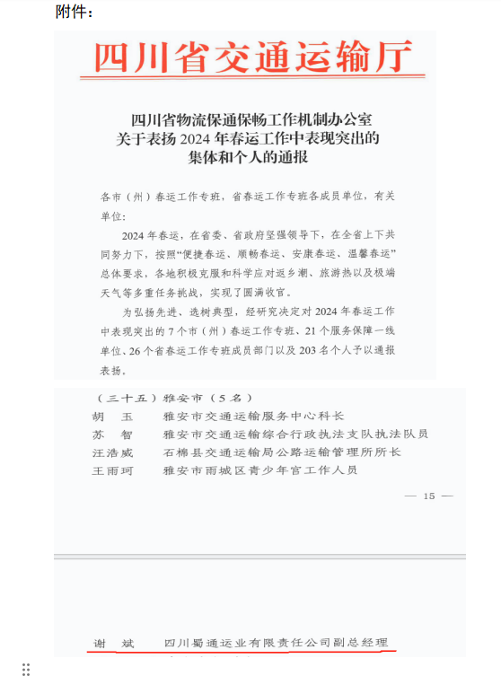 近日,交建集團(tuán)蜀通公司副總經(jīng)理謝斌獲四川省交通運(yùn)輸廳2024年春運(yùn)工作表現(xiàn)突出通報(bào)表?yè)P(yáng)。