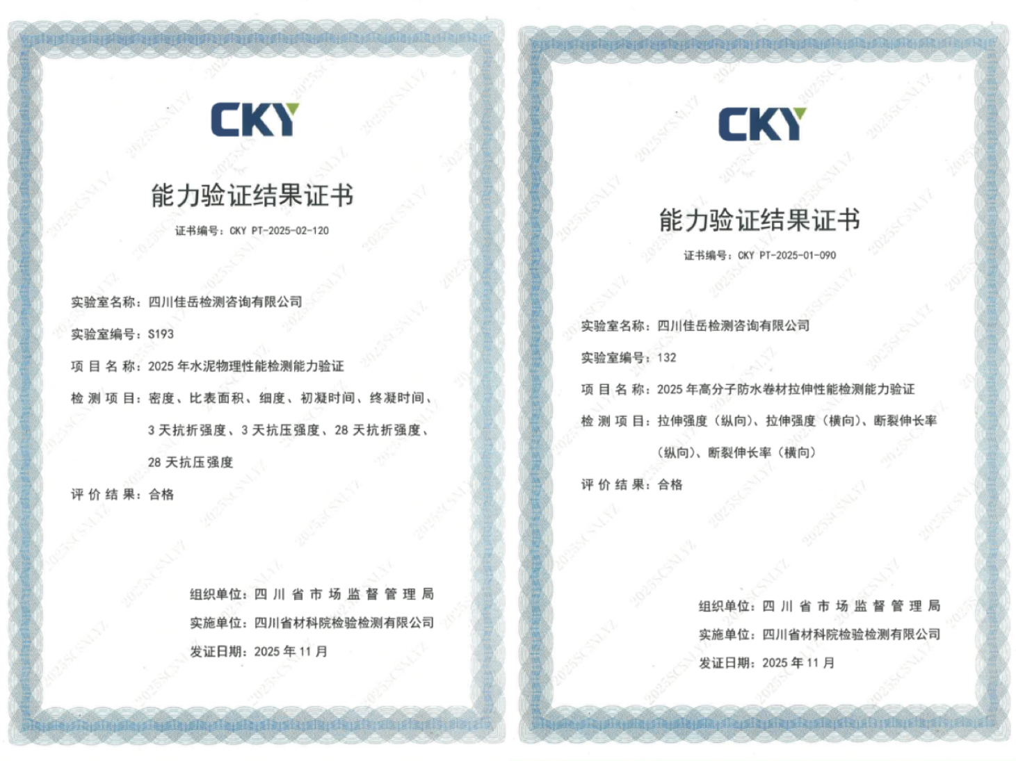 近日,佳岳公司順利完成2025年度檢測能力驗證工作,“高分子防水卷材拉伸性能檢測”與“水泥物理性能檢測”兩項項目結(jié)果均獲“滿意”評價。