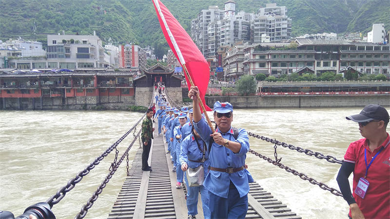 活動(dòng)中,全體黨員干部職工換上紅軍服、戴上紅軍帽,走上瀘定橋,觸摸著沾染了無數(shù)革命烈士鮮血的鐵索,瞬間將大家的思緒拉回到1935年的5月29日,22名勇士冒著敵人的槍林彈雨,攀著鐵鏈沖向?qū)Π叮⒂聤Z下瀘定橋,取得長征中的一次決定性勝利場景。大家無不被革命先輩的英勇與無畏所震撼。