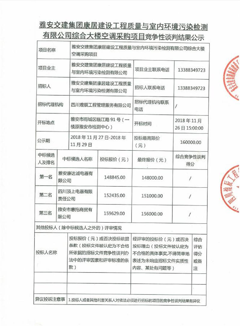 綜合大樓空調(diào)采購(gòu)項(xiàng)目競(jìng)爭(zhēng)性談判結(jié)果公示