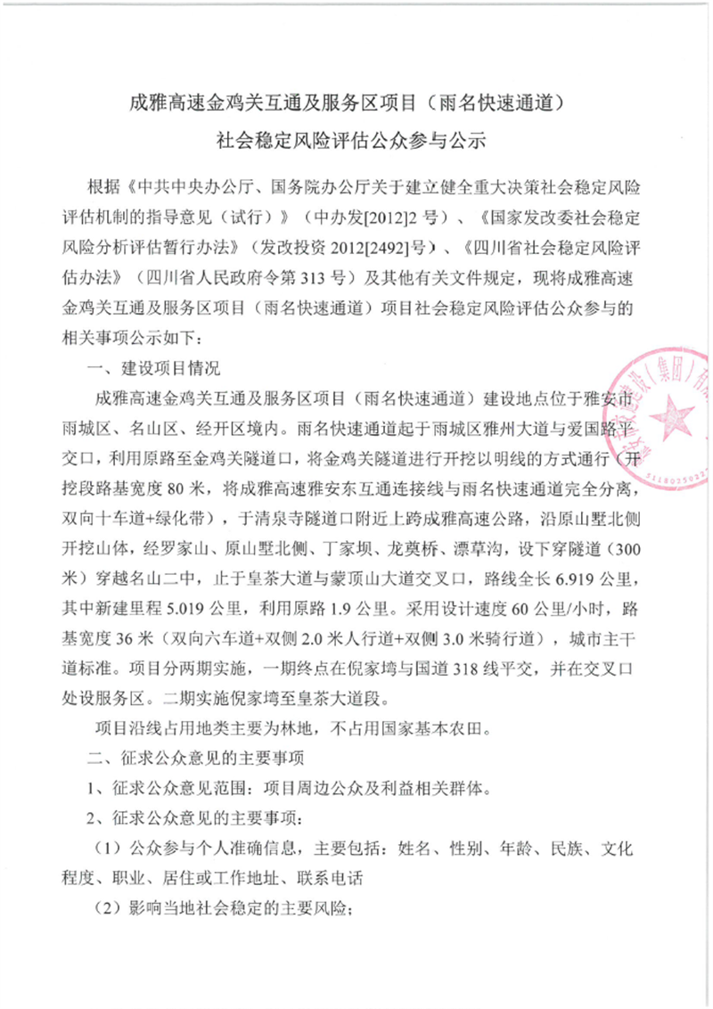 成雅高速金雞關(guān)互通及服務(wù)區(qū)項目(雨名快速通道)社會穩(wěn)定風(fēng)險評估公眾參與公示