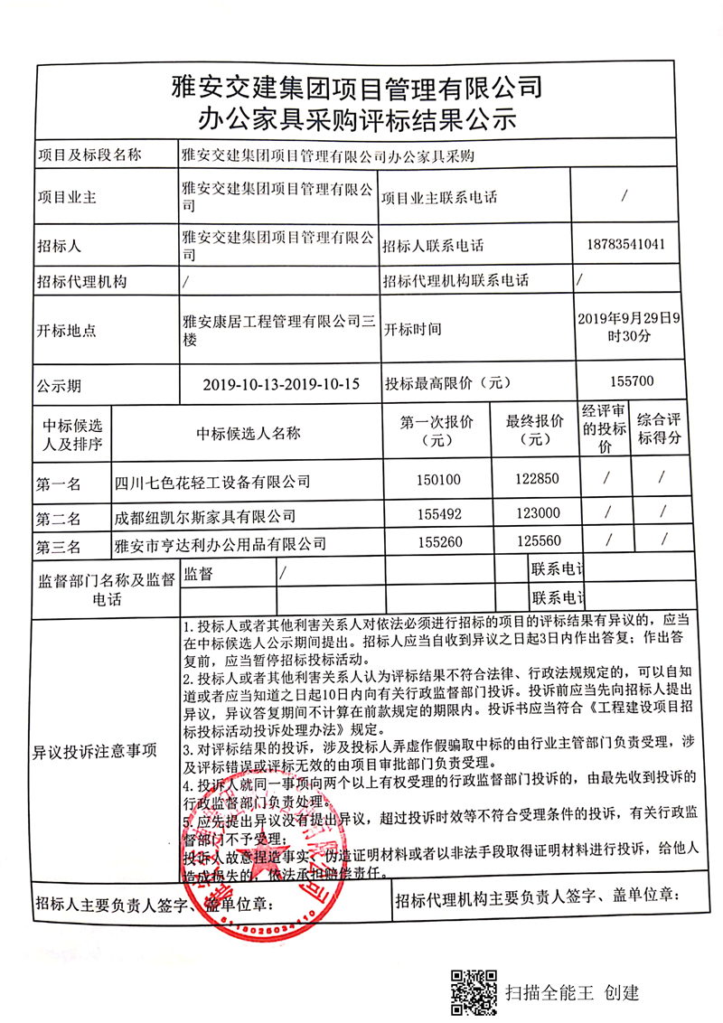 雅安交建集團項目管理有限公司辦公家具采購評標結果公示