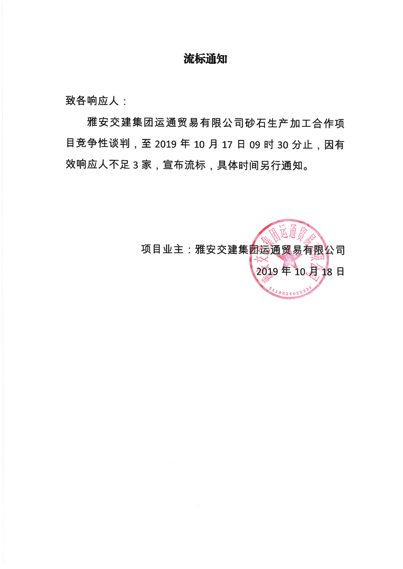雅安交建集團(tuán)運(yùn)通貿(mào)易有限公司砂石生產(chǎn)加工合作項(xiàng)目流標(biāo)通知