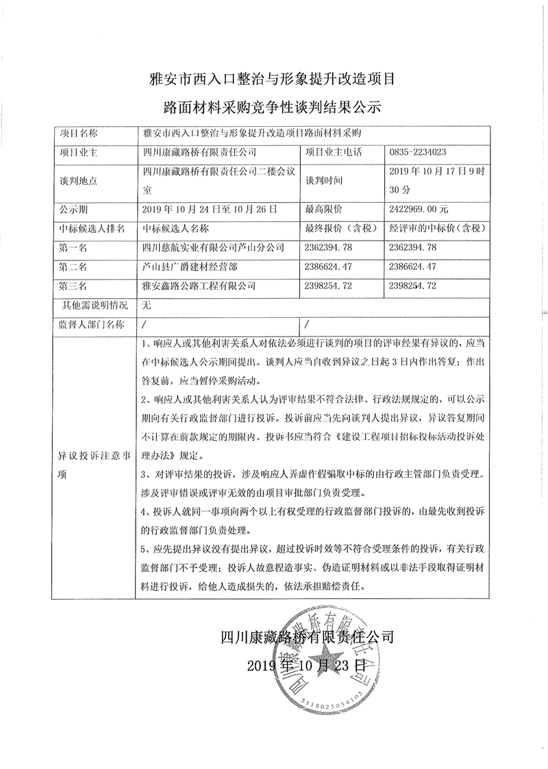 四川康藏路橋有限責(zé)任公司雅安市西入口整治與形象提升改造項(xiàng)目路面材料采購競(jìng)爭(zhēng)性談判結(jié)果公示