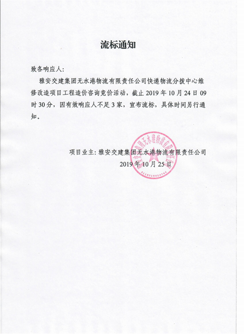 雅安交建集團(tuán)無水港物流有限責(zé)任公司快遞物流分撥中心維修改造項(xiàng)目工程造價(jià)咨詢競價(jià)流標(biāo)通知