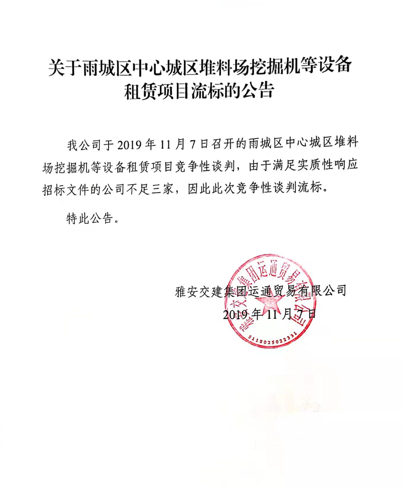 雅安交建集團運通貿(mào)易有限公司關(guān)于雨城區(qū)中心城區(qū)堆料場挖掘機等設(shè)備租賃項目流標的公告