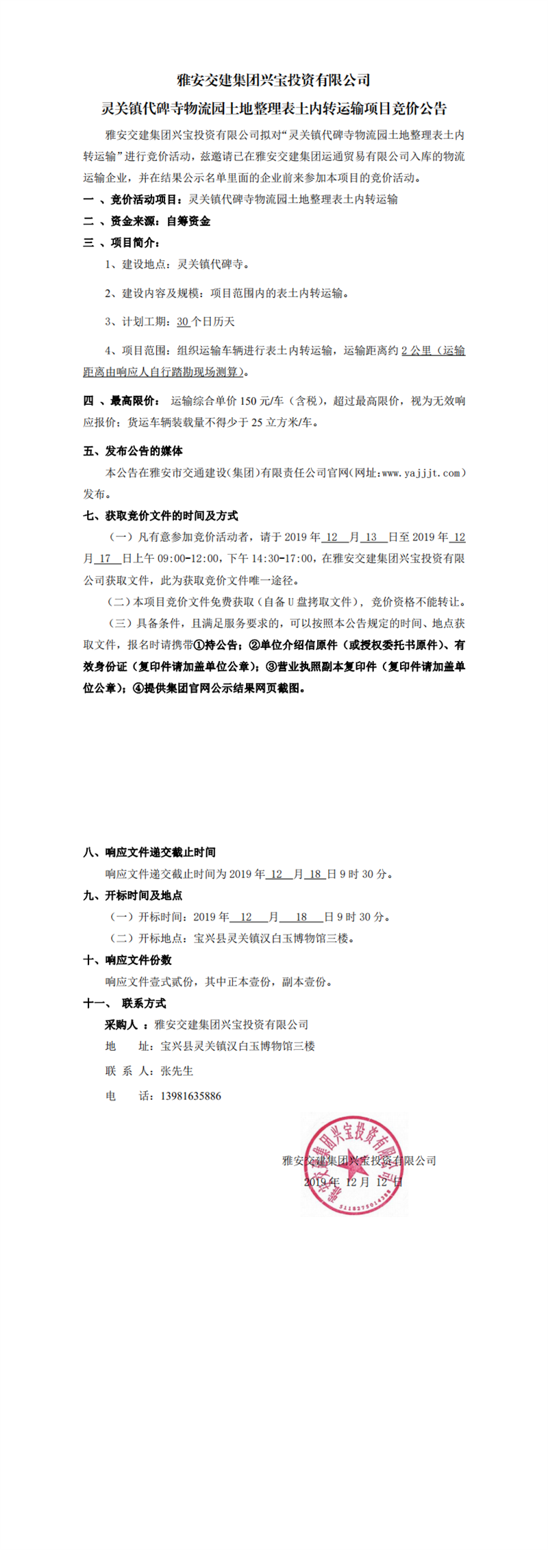 雅安交建集團興寶投資有限公司靈關鎮(zhèn)代碑寺物流園土地整理表土內(nèi)轉(zhuǎn)運輸項目競價公告