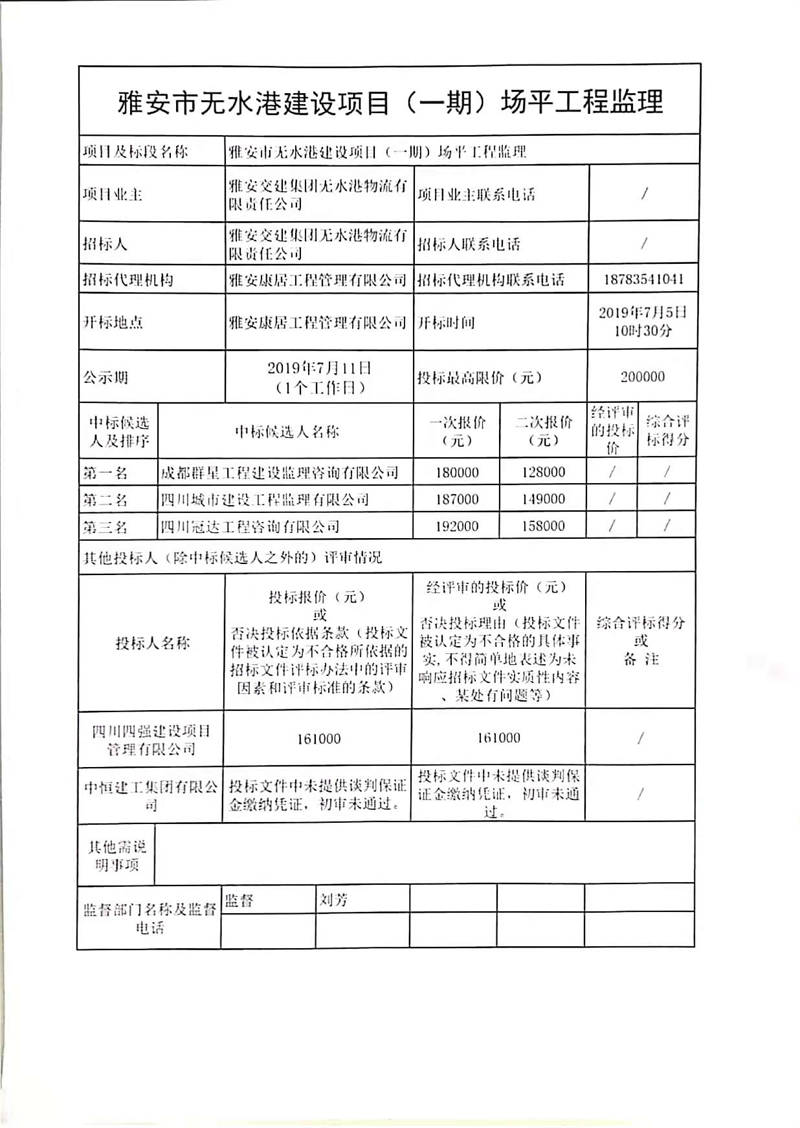 雅安交建集團(tuán)無(wú)水港物流有限責(zé)任公司雅安市無(wú)水港建設(shè)項(xiàng)目(一期)場(chǎng)平工程監(jiān)理競(jìng)爭(zhēng)性談判結(jié)果公示