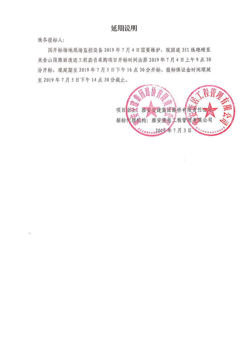 雅安交建集團路橋有限責任公司國道351線磽磧至夾金山段路面改造工程瀝青采購招標延期說明