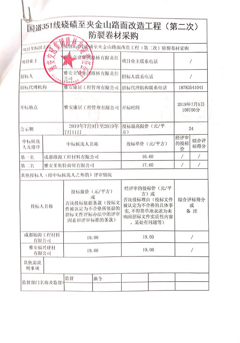 雅安交建集團(tuán)路橋有限責(zé)任公司國(guó)道351線磽磧至夾金山路面改造工程(第二次)防裂卷材采購(gòu)競(jìng)爭(zhēng)性談判結(jié)果公示