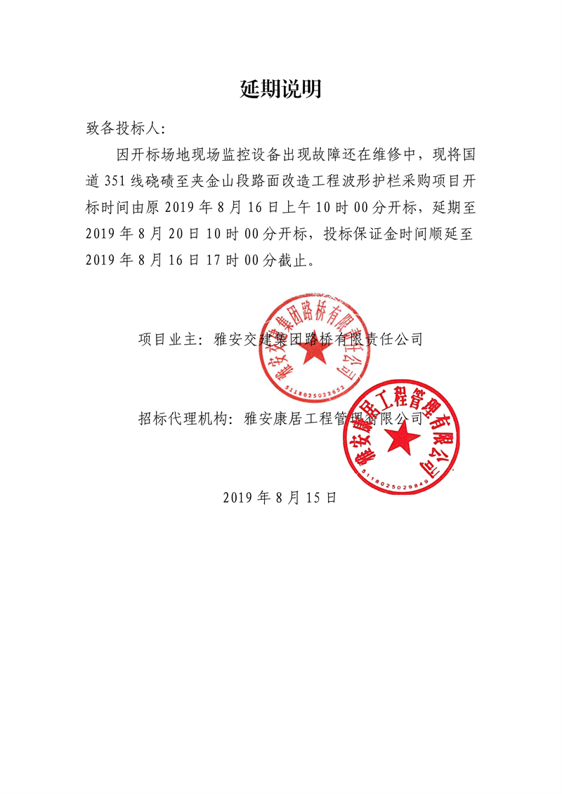 雅安交建集團(tuán)路橋有限責(zé)任公司國(guó)道351線磽磧至夾金山段路面改造工程波形護(hù)欄采購(gòu)延期說(shuō)明