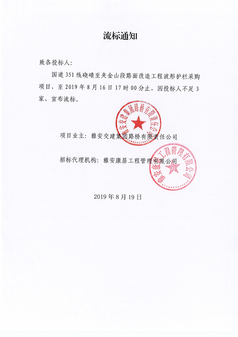 雅安交建集團(tuán)路橋有限責(zé)任公司國道351線磽磧至夾金山段路面改造工程波形護(hù)欄采購項(xiàng)目流標(biāo)通知