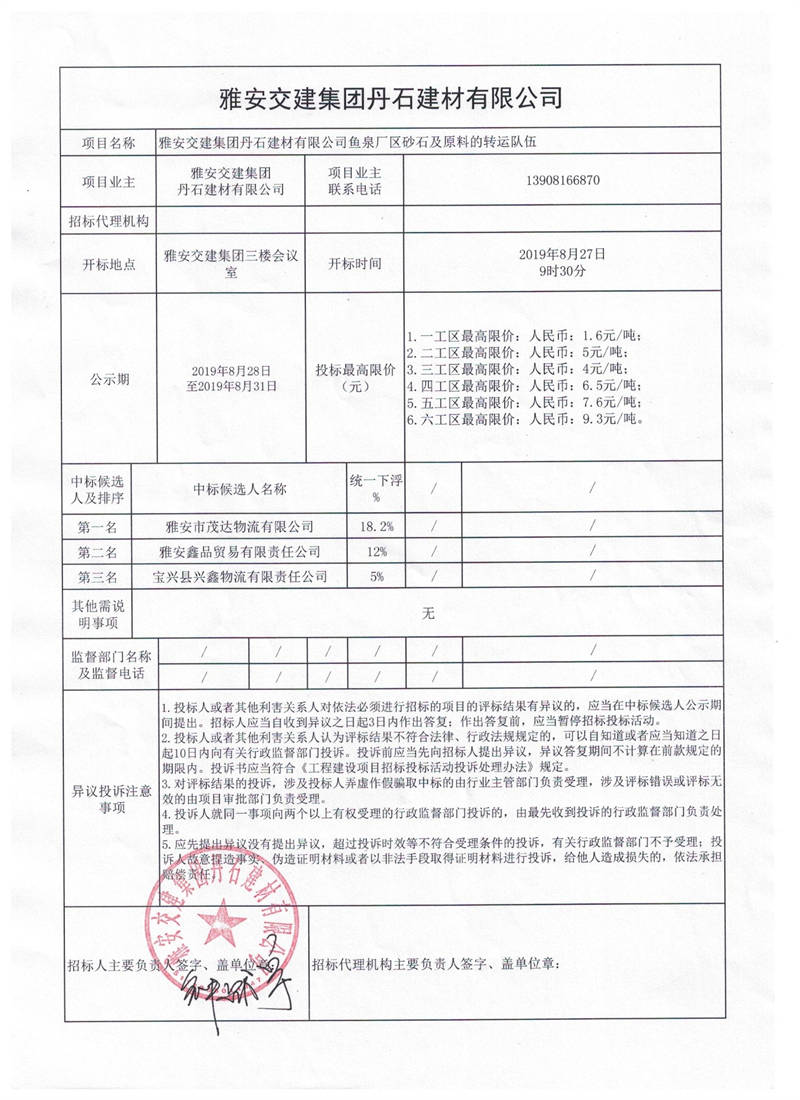 雅安交建集團(tuán)丹石建材有限公司魚泉廠區(qū)砂石及原料的轉(zhuǎn)運(yùn)隊(duì)伍項(xiàng)目競價結(jié)果公示