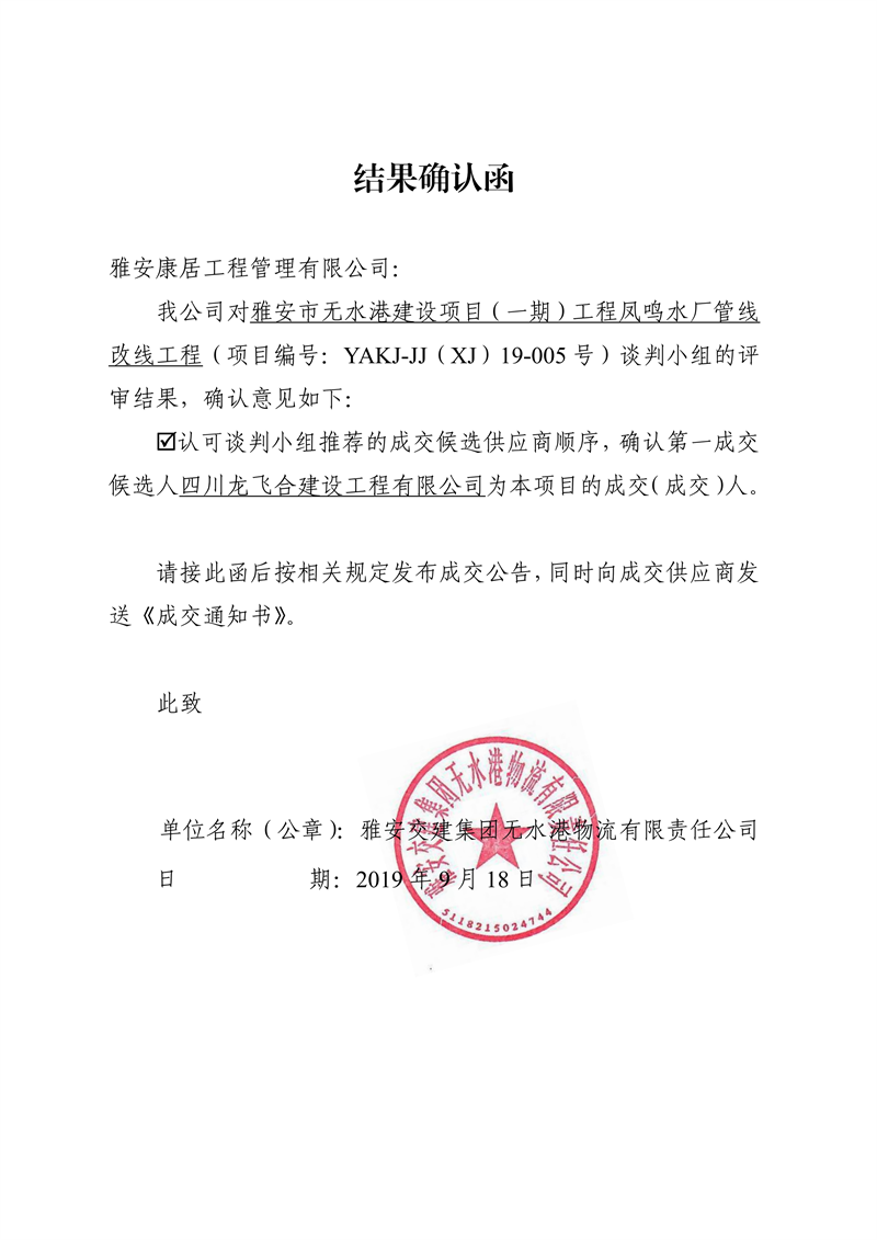 雅安交建集團(tuán)無(wú)水港物流有限責(zé)任公司雅安市無(wú)水港建設(shè)項(xiàng)目(一期)工程鳳鳴水廠(chǎng)管線(xiàn)改線(xiàn)工程競(jìng)爭(zhēng)性談判結(jié)果公示