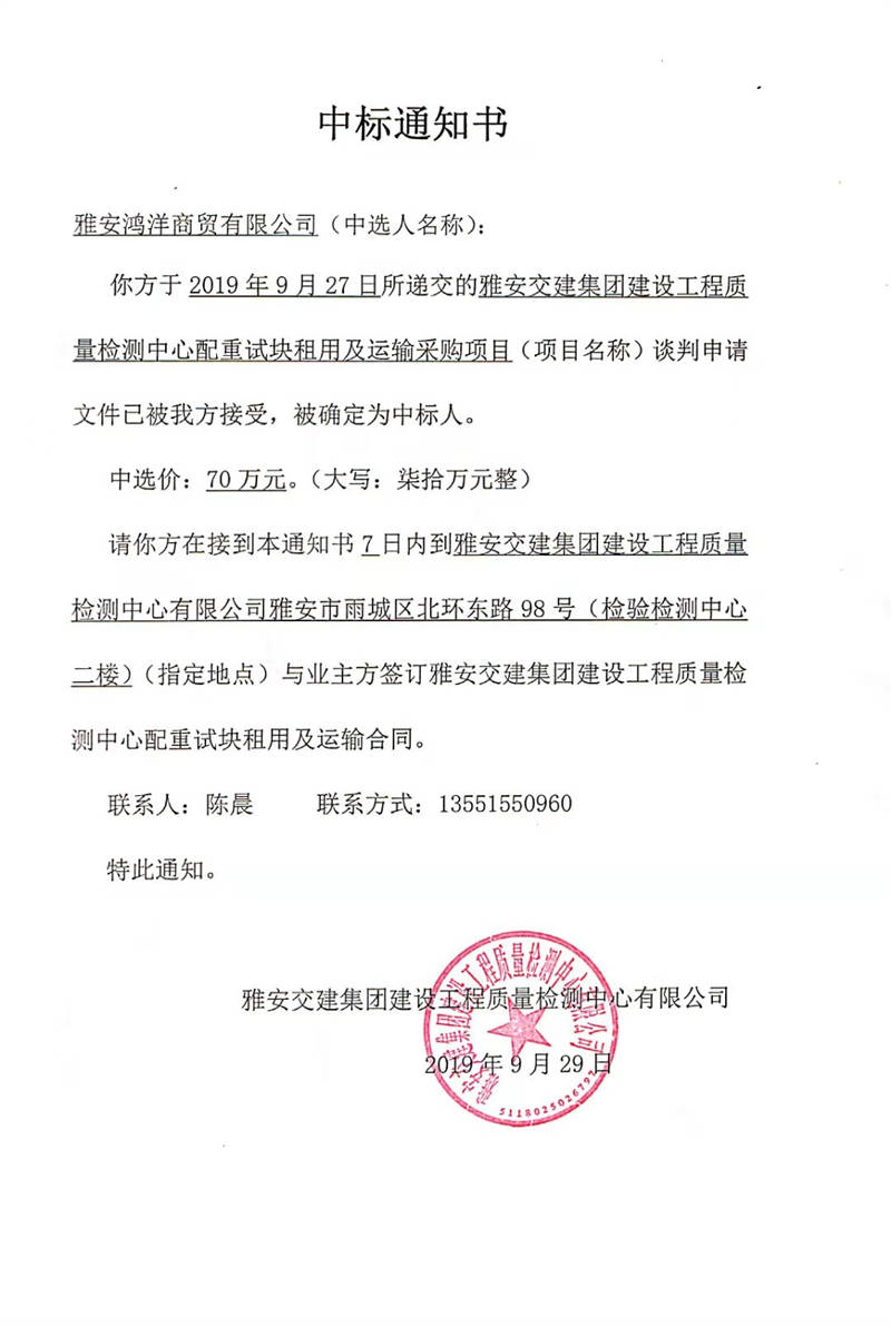 雅安交建集團(tuán)建設(shè)工程質(zhì)量檢測中心配重試塊租用及運(yùn)輸采購項(xiàng)目中標(biāo)公示
