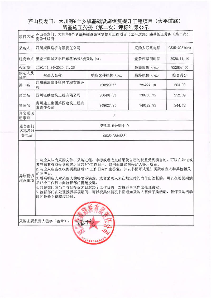 四川康藏路橋有限責任公司蘆山縣龍門、大川等8個鄉(xiāng)鎮(zhèn)基礎(chǔ)設(shè)施恢復提升工程項目(太平道路)路基施工勞務(第二次)評標結(jié)果公示