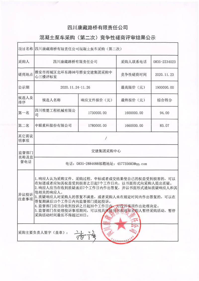 四川康藏路橋有限責任公司混凝土泵車采購(第二次)競爭性磋商評審結(jié)果公示