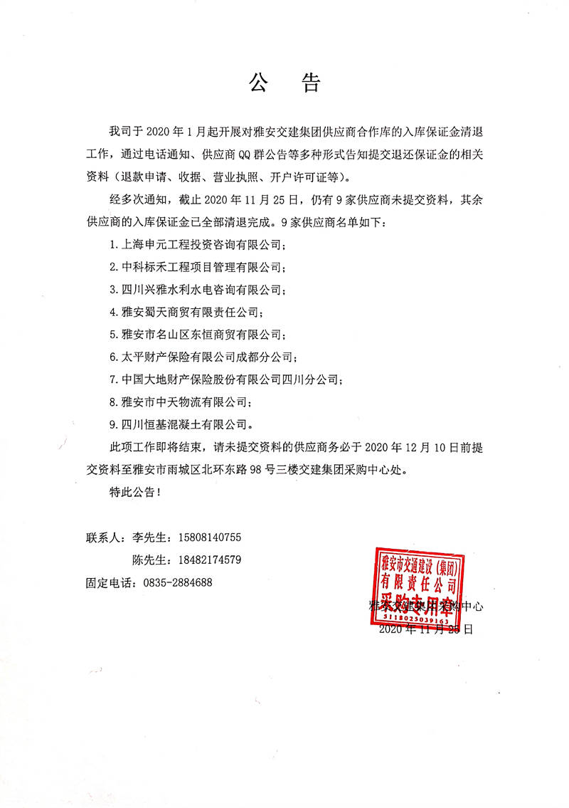 關于雅安交建集團供應商合作庫入庫保證金清退相關事宜的公告