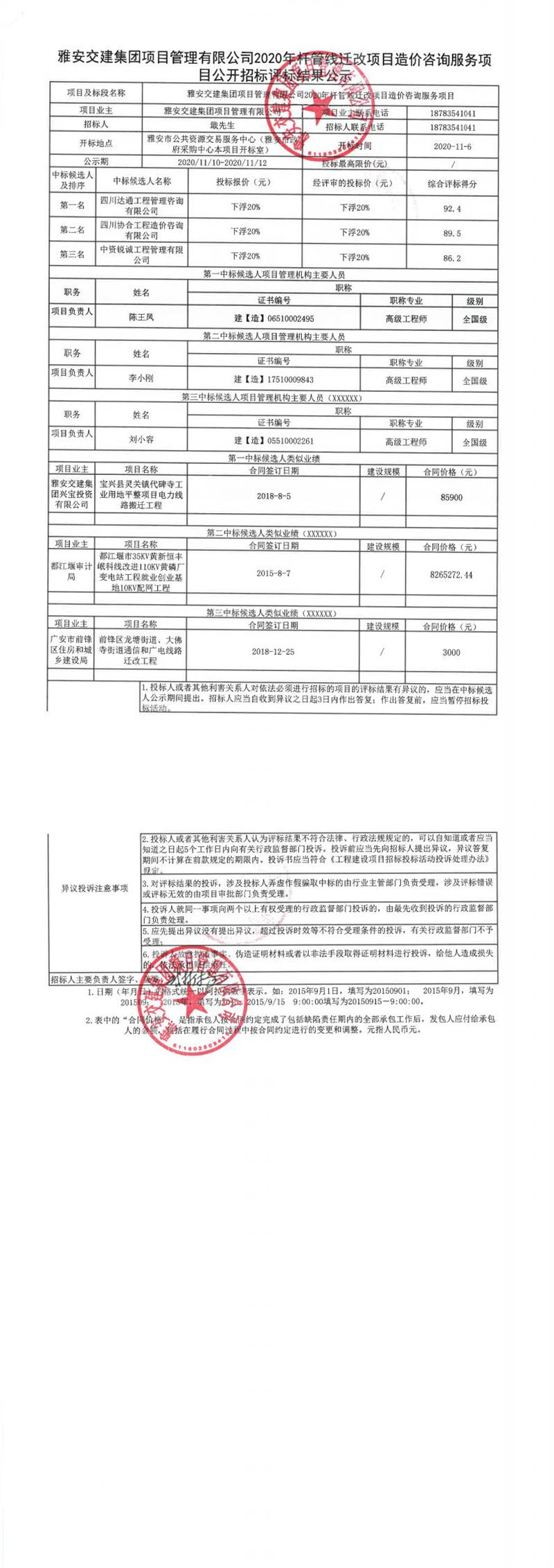 雅安交建集團項目管理有限公司2020年桿管線遷改項目造價咨詢服務(wù)項目公開招標評標結(jié)果公示