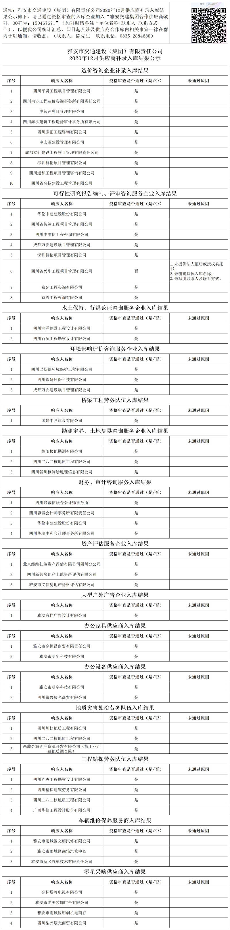 雅安市交通建設(shè)(集團(tuán))有限責(zé)任公司2020年12月供應(yīng)商補(bǔ)錄入庫結(jié)果公示
