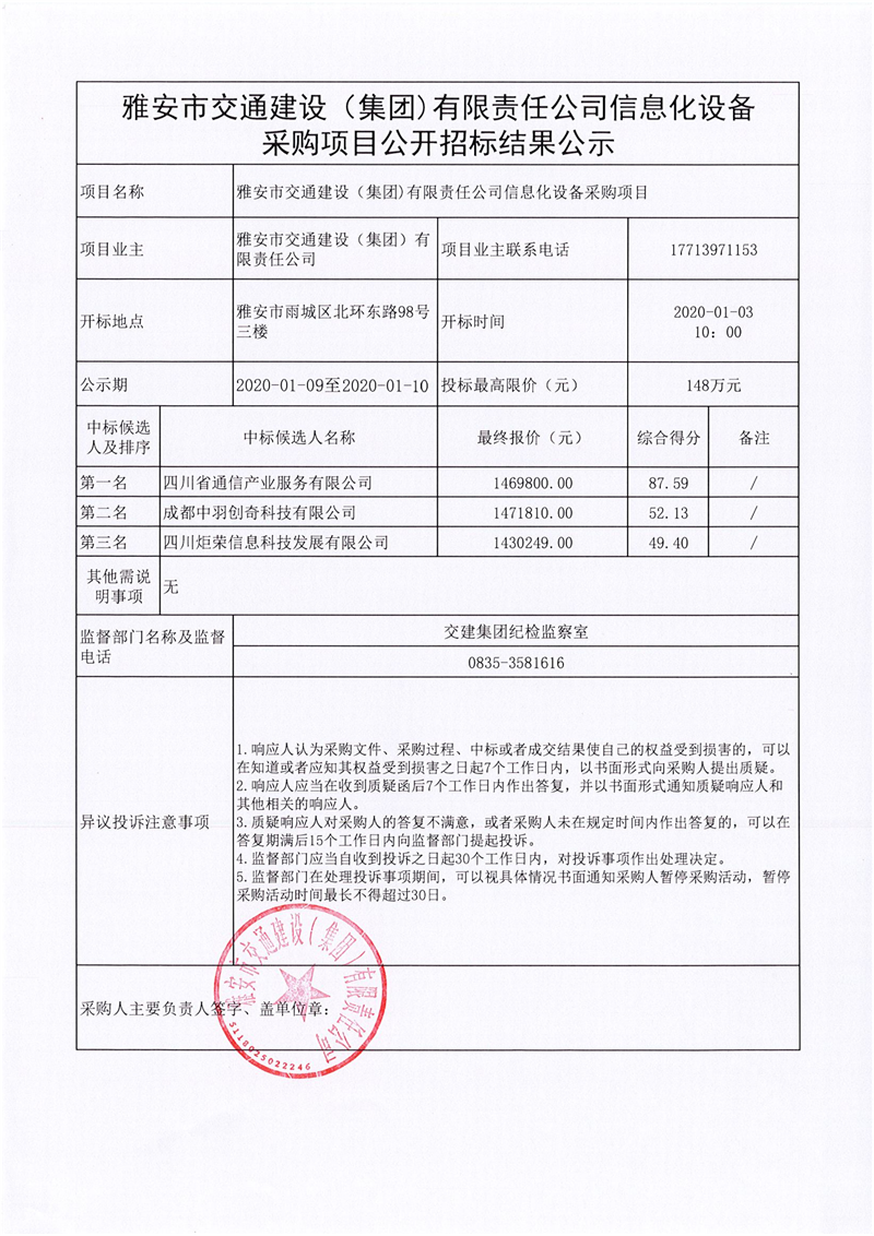 雅安市交通建設(shè)(集團(tuán))有限責(zé)任公司信息化設(shè)備采購(gòu)項(xiàng)目公開(kāi)招標(biāo)結(jié)果公示