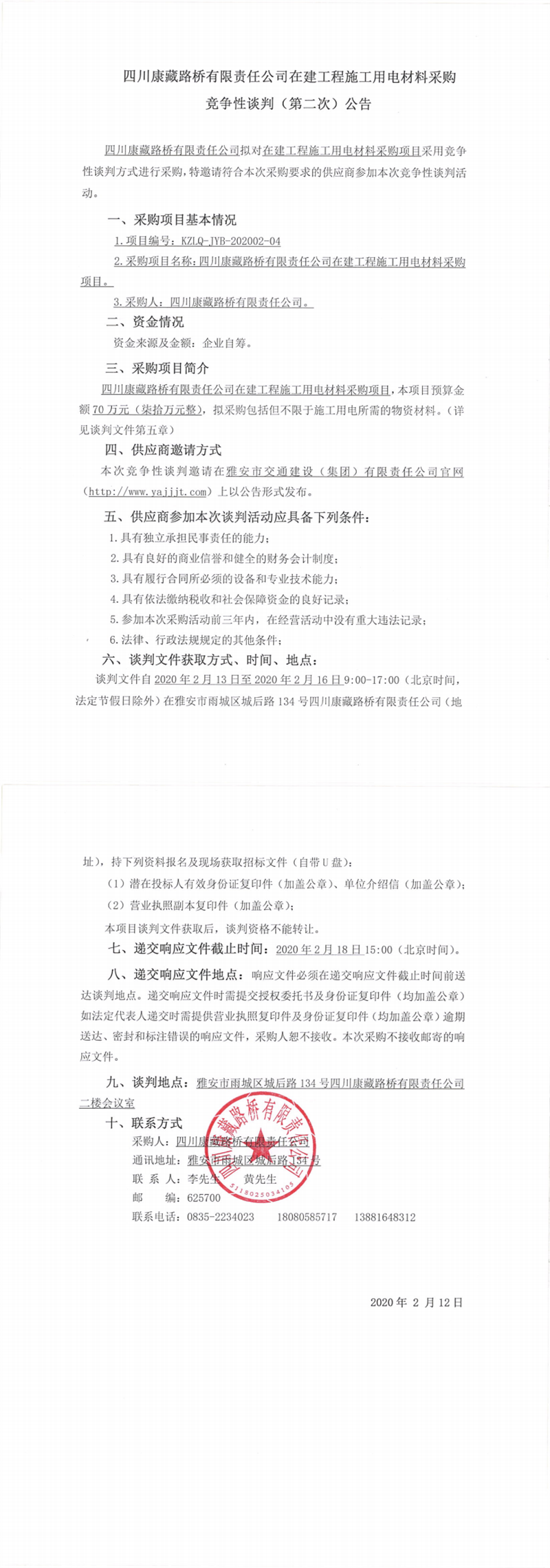 四川康藏路橋有限責(zé)任公司在建工程施工用電材料采購競(jìng)爭(zhēng)性談判(第二次)公告