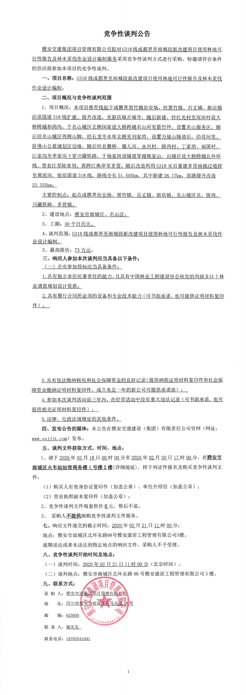 雅安交建集團項目管理有限公司G318線成都界至雨城段新改建項目使用林地可行性報告及林木采伐作業(yè)設計編制競爭性談判公告