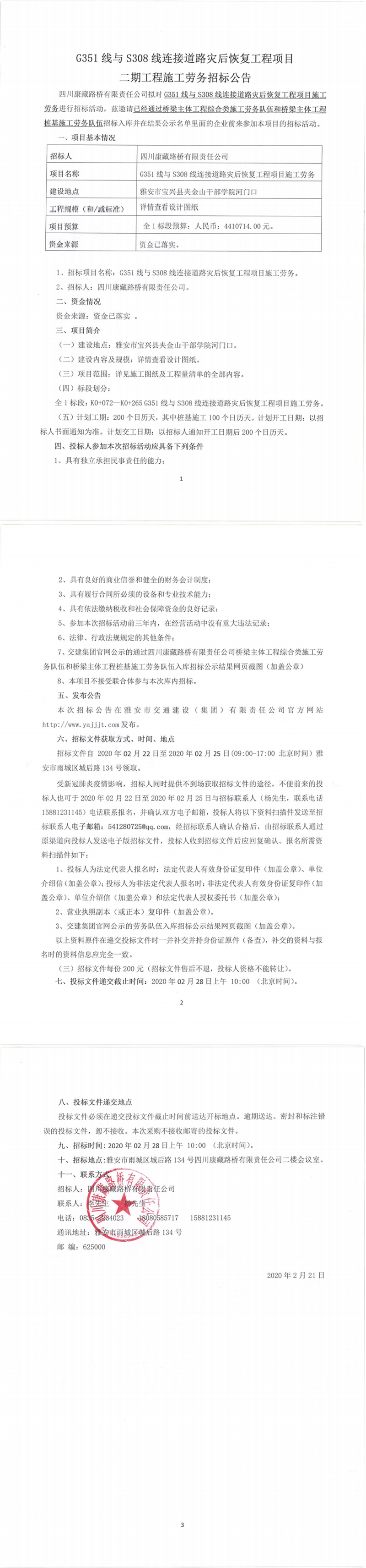 四川康藏路橋有限責(zé)任公司G351線與S308線連接道路災(zāi)后恢復(fù)工程項(xiàng)目二期工程施工勞務(wù)招標(biāo)公告