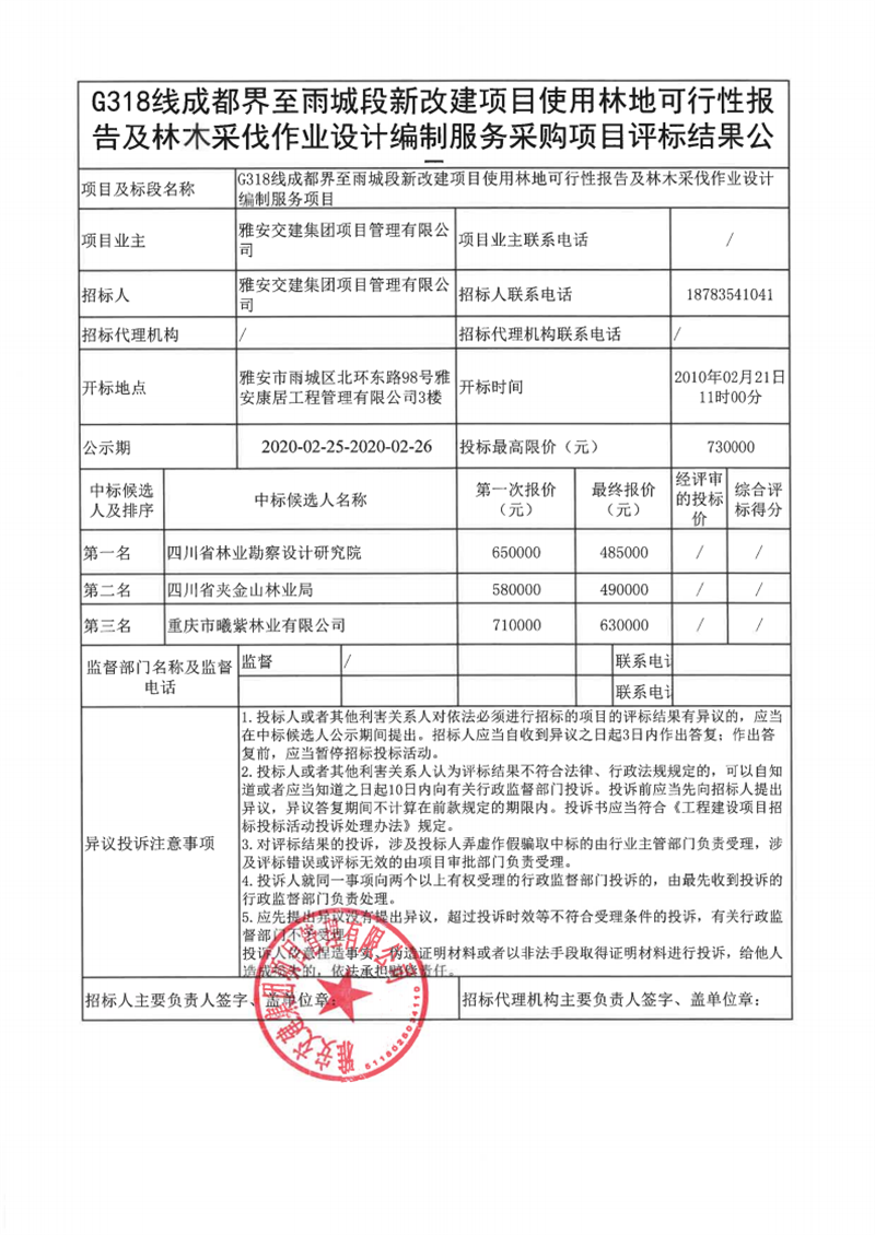 雅安交建集團項目管理有限公司G318線成都界至雨城段新改建項目使用林地可行性報告及林木采伐作業(yè)設(shè)計編制服務采購項目評標結(jié)果公示