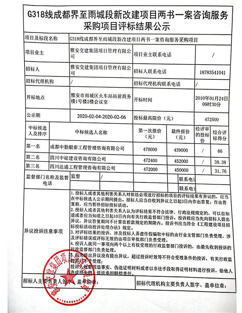 雅安交建集團項目管理有限公司G318線成都界至雨城段新改建項目踏勘論證、規(guī)劃修改及基本農(nóng)田調(diào)整補劃、臨時用地復墾方案編制服務采購項目評標結(jié)果公示