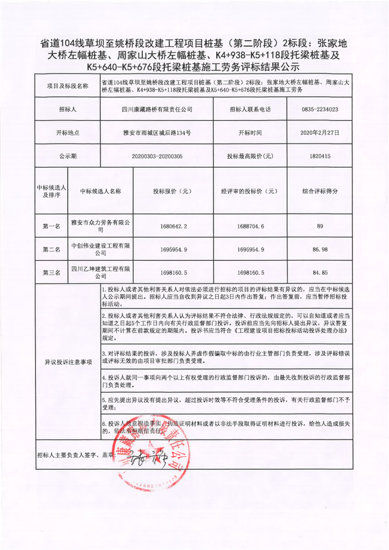 四川康藏路橋有限責(zé)任公司省道104線草壩至姚橋段改建工程項目樁基(第二階段)2標(biāo)段:張家地大橋左幅樁基、周家山大橋左幅樁基、K4+938-K5+118段托梁樁基及K5+640-K5+676段托梁樁基施工勞務(wù)評標(biāo)結(jié)果公示