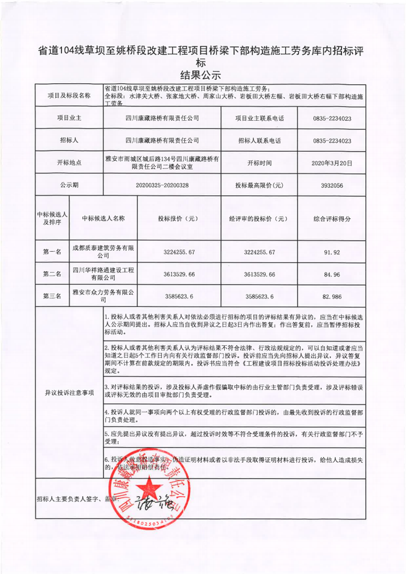 四川康藏路橋有限責(zé)任公司省道104線草壩至姚橋段改建工程項(xiàng)目橋梁下部構(gòu)造施工勞務(wù)評標(biāo)結(jié)果公示