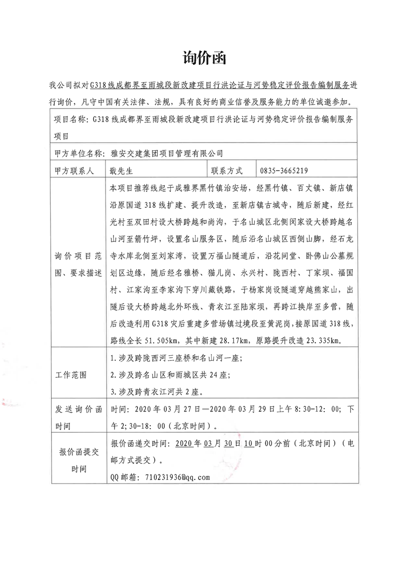 雅安交建集團(tuán)項(xiàng)目管理有限公司G318線成都界至雨城段新改建項(xiàng)目行洪論證與河勢穩(wěn)定評價報告編制服務(wù)項(xiàng)目詢價函