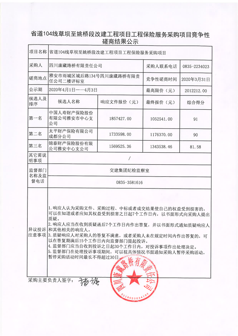 四川康藏路橋有限責(zé)任公司省道104線草壩至姚橋段改建工程項(xiàng)目工程保險服務(wù)采購項(xiàng)目競爭性磋商結(jié)果公示