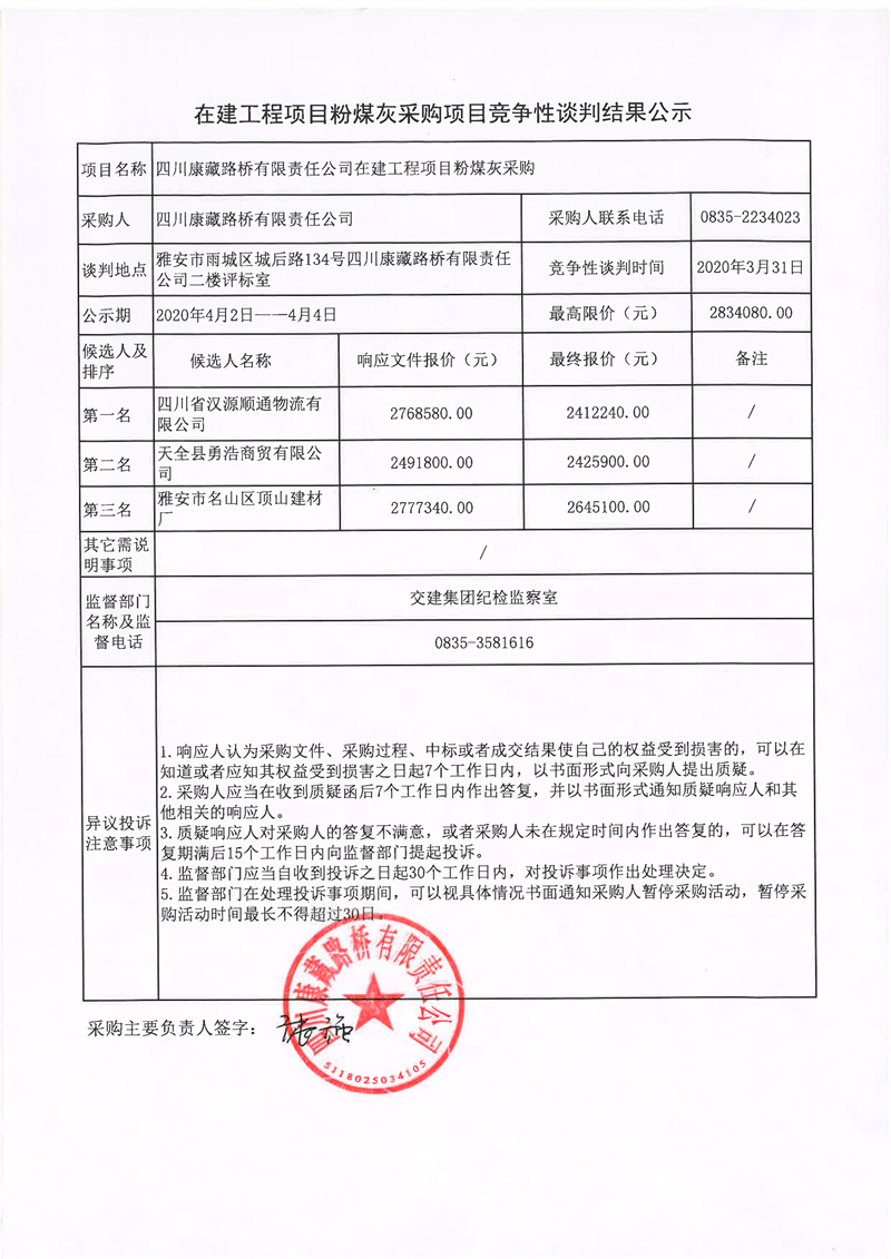 四川康藏路橋有限責(zé)任公司在建工程項目粉煤灰采購項目競爭性談判結(jié)果公示