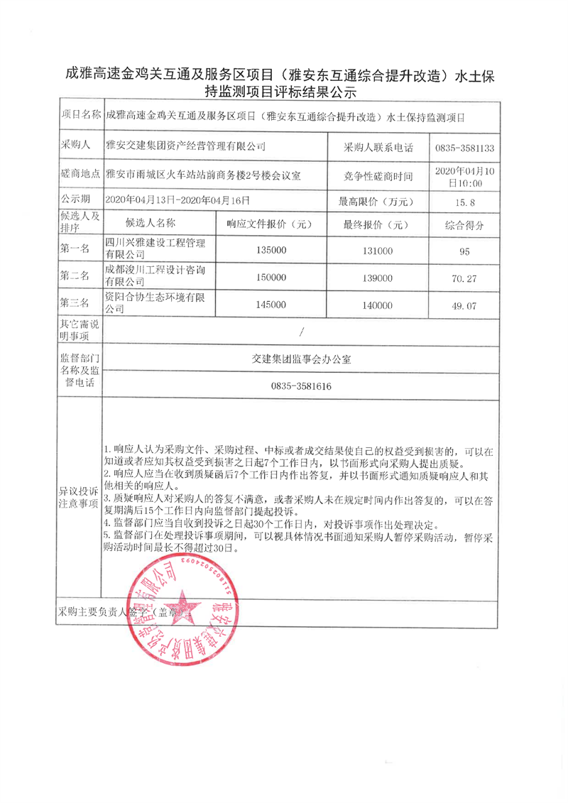雅安交建集團(tuán)資產(chǎn)經(jīng)營管理有限公司成雅高速金雞關(guān)互通及服務(wù)區(qū)項(xiàng)目(雅安東互通綜合提升改造)水土保持監(jiān)測項(xiàng)目評(píng)標(biāo)結(jié)果公示
