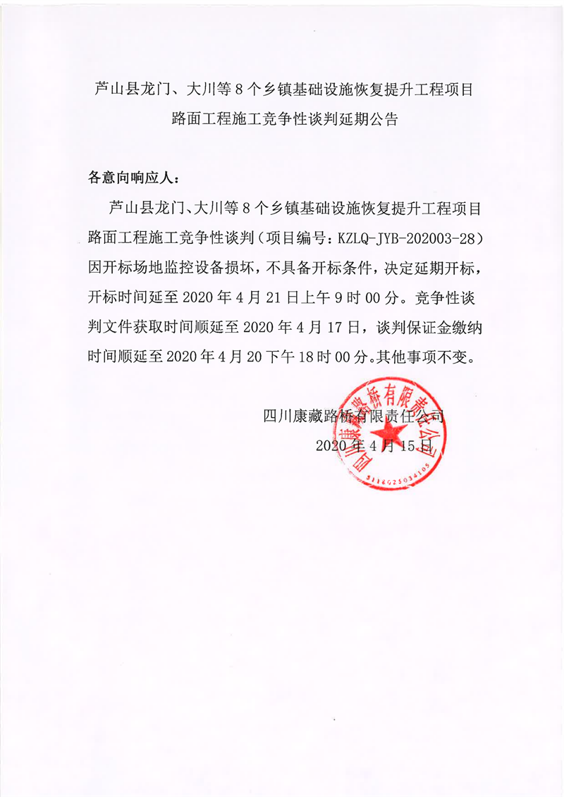 四川康藏路橋有限責(zé)任公司蘆山縣龍門、大川等8個(gè)鄉(xiāng)鎮(zhèn)基礎(chǔ)設(shè)施恢復(fù)提升工程項(xiàng)目路面工程施工競爭性談判延期公告