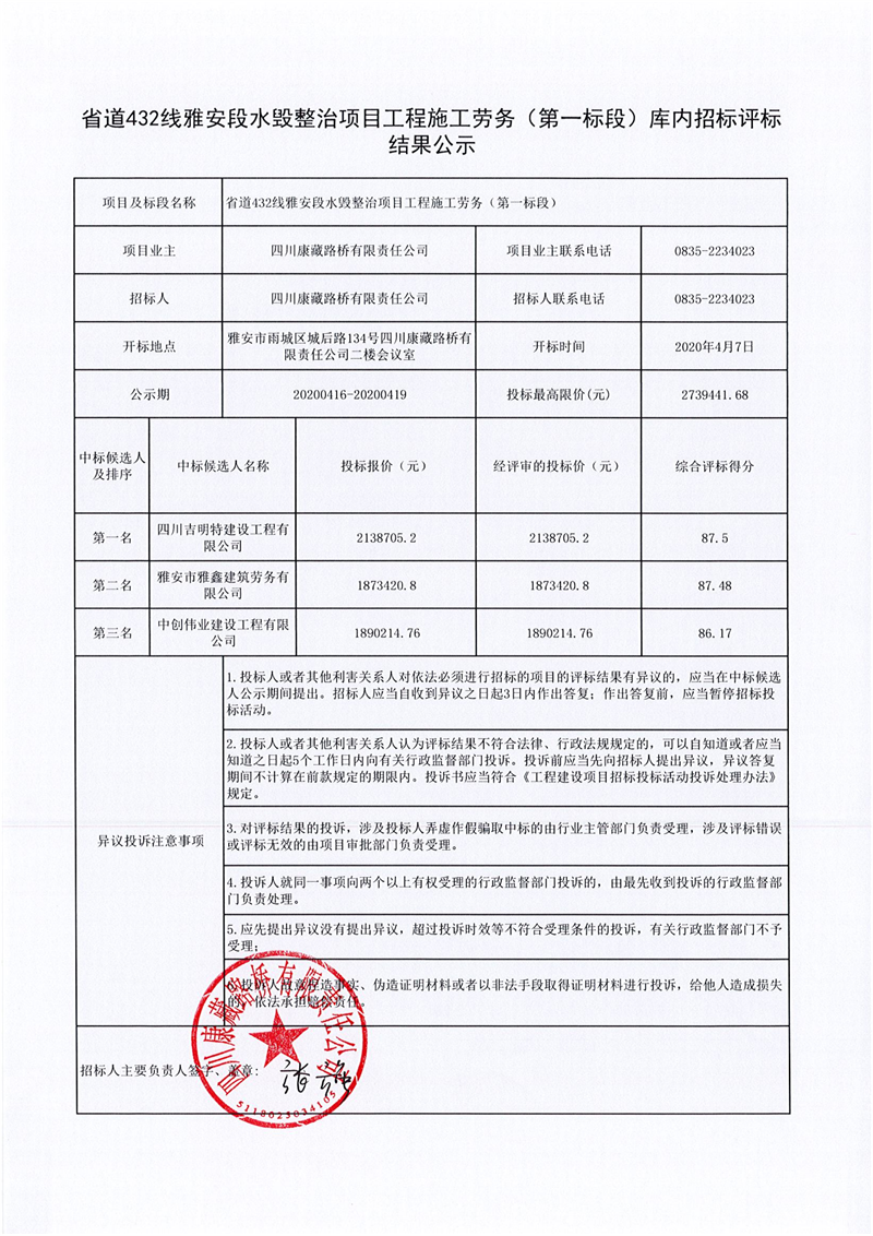 四川康藏路橋有限責任公司省道432線雅安段水毀整治項目工程施工勞務(第一標段)庫內(nèi)招標評標結(jié)果公示