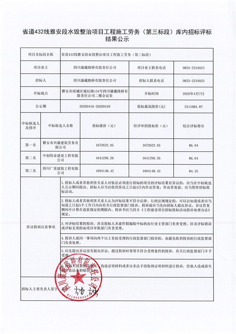 四川康藏路橋有限責任公司省道432線雅安段水毀整治項目工程施工勞務(第三標段)庫內招標評標結果公示