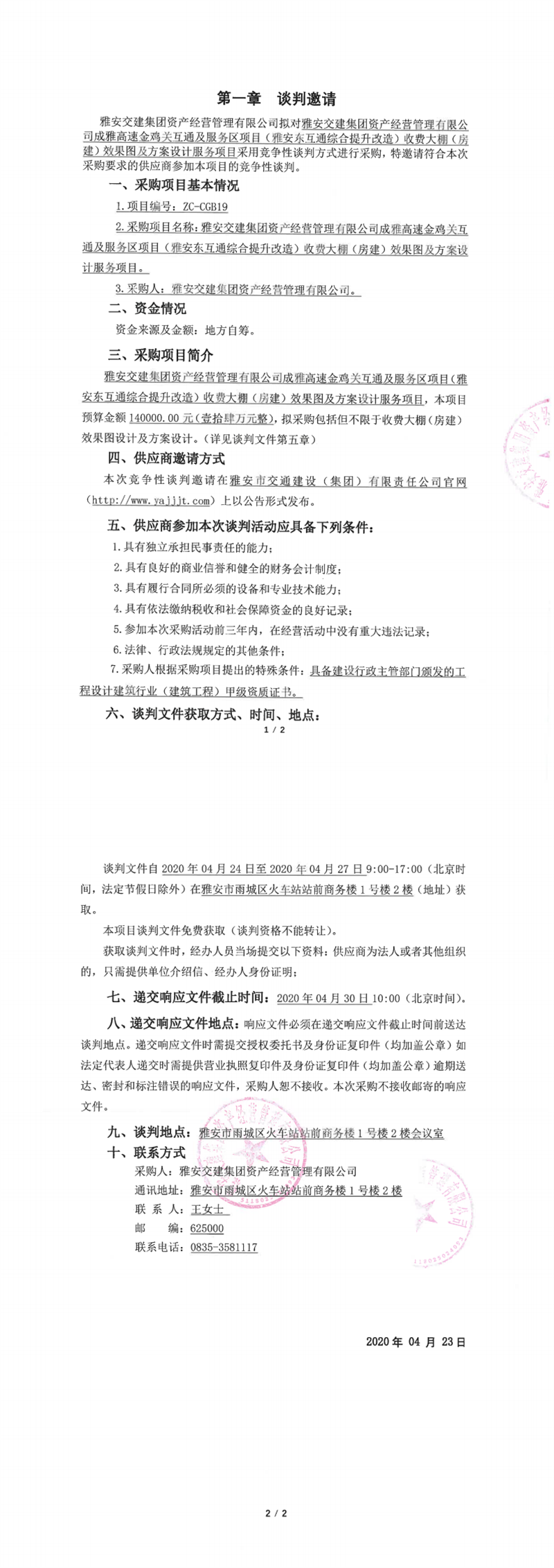雅安交建集團資產(chǎn)經(jīng)營管理有限公司成雅高速金雞關互通及服務區(qū)項目(雅安東互通綜合提升改造)收費大棚(房建)效果圖及方案設計服務項目競爭性談判公告
