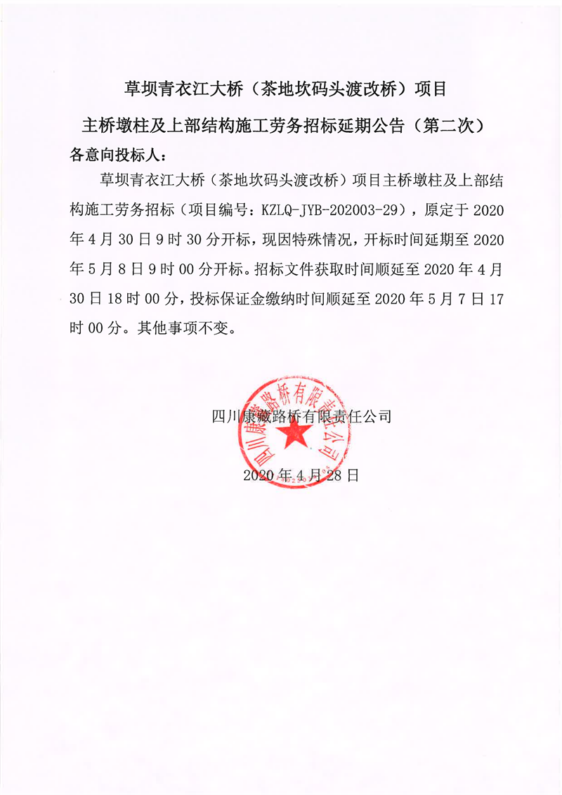 四川康藏路橋有限責任公司草壩青衣江大橋(茶地坎碼頭渡改橋)項目主橋墩柱及上部結(jié)構(gòu)施工勞務(wù)招標延期公告(第二次)