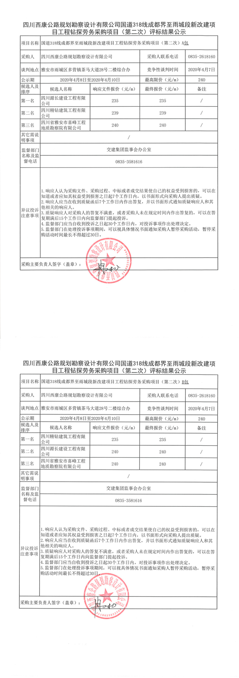 四川西康公路規(guī)劃勘察設(shè)計有限公司國道318線成都界至雨城段新改建項目工程鉆探勞務(wù)采購項目(第二次)評標結(jié)果公示
