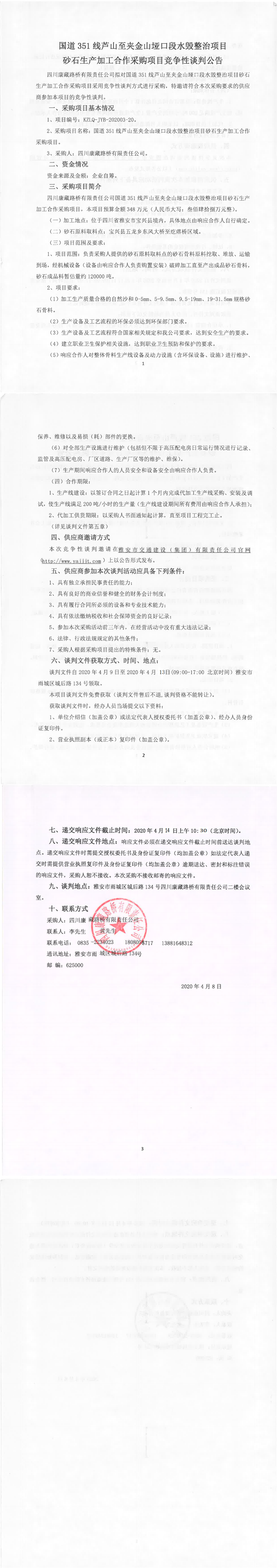四川康藏路橋有限責(zé)任公司國道351線蘆山至夾金山埡口段水毀整治項目砂石生產(chǎn)加工合作采購項目競爭性談判公告