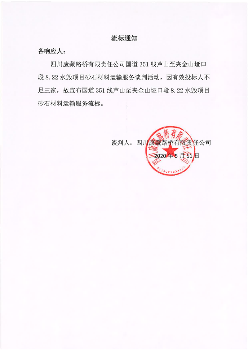 四川康藏路橋有限責(zé)任公司國(guó)道351線蘆山至夾金山埡口段8.22水毀項(xiàng)目砂石材料運(yùn)輸服務(wù)流標(biāo)通知