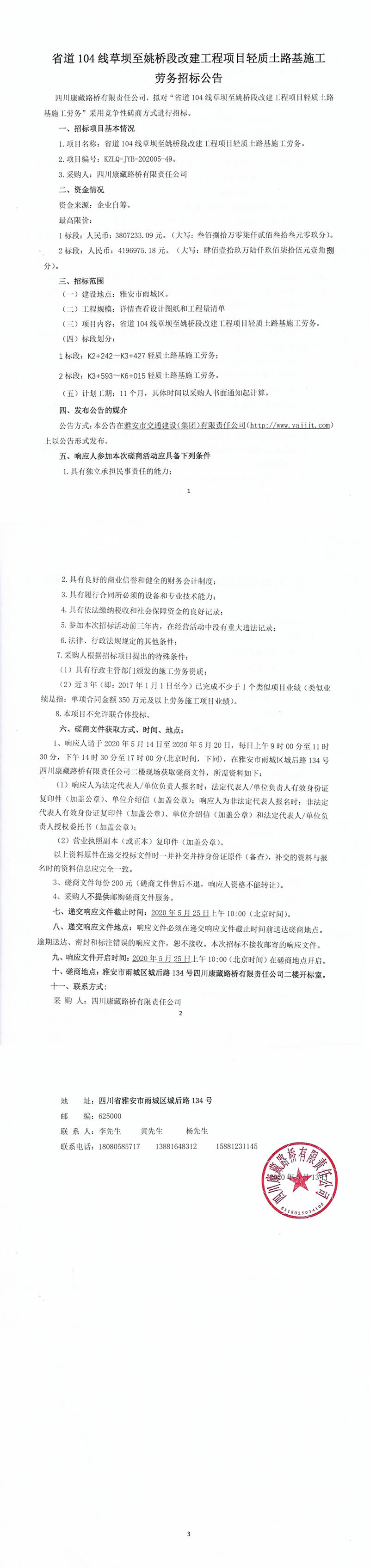 四川康藏路橋有限責任公司省道104線草壩至姚橋段改建項目輕質(zhì)土路基施工勞務招標公告